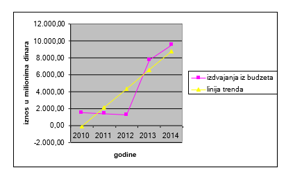 Vremenskim linearnim trendom smo prikazali trend kretanja izdvajanja iz budžeta Republike Srbije, modelom linearnog trenda, kroz vremenski period od 2010. godine do 2014. godine. U dijagramu, izdvajanja iz budžeta Republike Srbije i model linearnog trenda, se vidi da je trend izdvajanja iz budžeta za zaštitu životne sredine rastao.