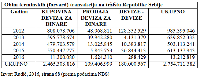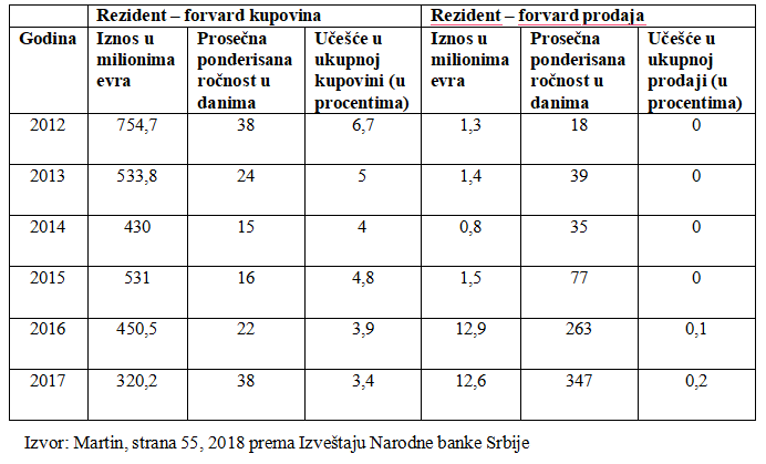 Na osnovu tabelarnog prikaza može se uočiti da je učešće terminske kupovine i terminske prodaje deviza u prikazanim apsolutnim, kao i u relativnim iznosima zanemarljivo nisko. Tako na primer, u 2017. godine zabeležena je forvard kupovina rezidenta u iznosu od 320,2 mln evra ili 3,4% i forvard prodaja rezidenta u iznosu od 12,6 mln evra ili 02%.