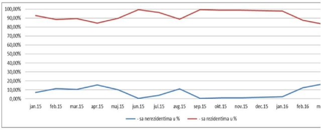 - Može se uočiti da je učešće nerezidenata u celokupnom iznosu trgovanja izražen na kraju 2015. godine i na početku 2016. godine;