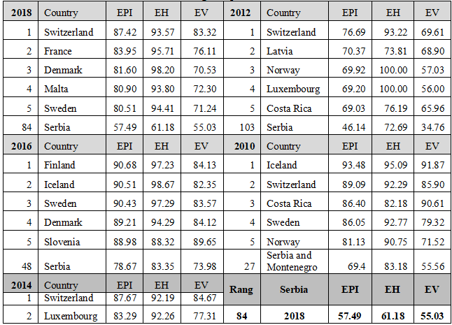 Rich countries and developing countries have financial resources for economic development, respect ecosystems and natural resources management, and pay special attention to improving public health and creating a clean water, sanitation and energy. The EPI index of Serbia indicates that in 2012 the country was at 103 place, which is the worst indicator of the EPI in both areas (EH and EV). After a slight improvement in the period 2014-2016, in the year 2018, the indicators are at the lowest level, with the vitality of the ecosystem in a much worse position. The interdependence between low levels of GDP and low EPI index values has also been observed.