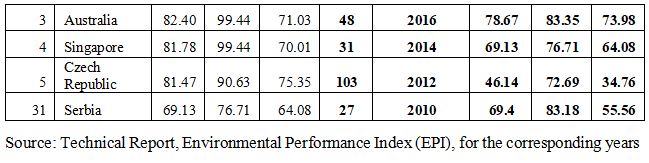 Quantitative indicators of the environment performance will facilitate the identification of problems, monitor trends, underline the success and failure of policies as well as identify best practices and optimize the return on investment in environmental protection. Analysis of the EPI index shows that Switzerland is at the top of the scale with a score of 87.42 according to the overall environmental performance. It is followed by France (83.95), Denmark (81.60), Malta (80.9) and Sweden (80.51). In the overall EPI index, Denmark, Malta and Sweden have a high score of air quality. In addition, Malta has the highest score in water and sanitation, and Sweden has achieved the highest levels of exposure to lead. Last places are occupied by Nepal (31.44), India (30.57), DR Congo (30.41), Bangladesh (29.56) and Burundi (27.43). The extremely low EPI index values show that countries must work more intensively (especially when it comes to air, protecting biodiversity and reducing the greenhouse effect). Low EPI index values are directly related to poor monitoring and control. In China (120), South Africa (142) and India (177) there is a strong negative tendency. Seychelles, has achieved significant results in increasing its score from 47.05 to 66.02, thanks to its high commitment and fight against greenhouse gas emissions.