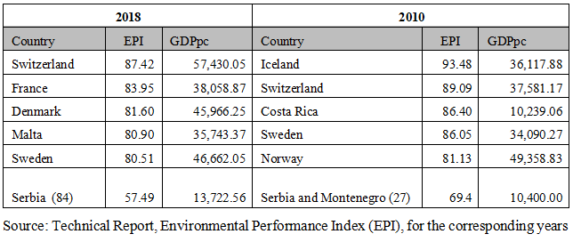 Table 3. Overview of the EPI Index and GDP in 2010 and 2018