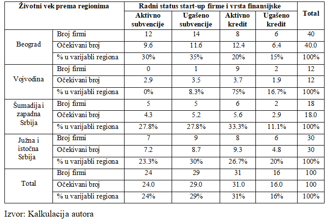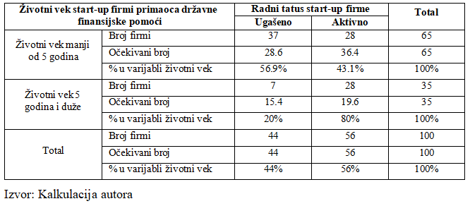 Uzimajući u obzir da smo dokazali međuzavisnost između životnog veka start- up firmi i njihovog radnog statusa (aktivno, ugašeno), moguće je dobiti dodatne podatke analizirajući tabelu kontigencije (Tabela 2). Naime, aktivan broj preduzeća koja su imala životni vek manji od 5 godina je 28 (očekivano 36.4), što je manje od broja ugašenih. Sa druge strane, aktivan broj preduzeća koja su imala životni vek 5 godina i više je 28 (očekivano 19.9). Ukupno posmatrano, na uzorku od 100 preduzeća, 56% start-up firmi primaoca državne finansijke pomoći je uspelo da preživi 5 godina i duže. Na osnovu toga, moguće je opovrgnuti tvrdnje pojedinih autora, kako više od polovine novih preduzeća ne preživi prvih 5 godina postojanja (Erić, 2012: 27,28; Čokorilo et al, 2017).