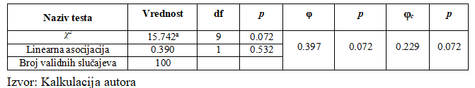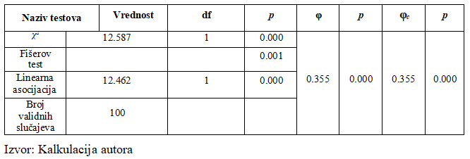 (Tabela 2). Prikazano je da su statistički značajne p = 0.00 obe mere veličina efekata, odnosno φ i φc. Isto tako, obe mere imaju iste vrednosti φ = φc = 0.355. Na osnovu toga, moguće je zaključiti da postoji osrednji efekat međuzavisnosti između veka start-up firmi, koje su primaoci državne finansijske pomoći i radnog statusa firmi.