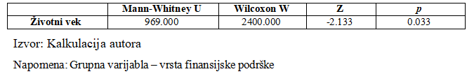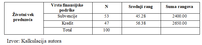 Na osnovu test statistike, pošto je nivo statističke značajnosti p = 0.033, što je manje od 0.05, moguće je slobodno tvrditi da postoji statistička značajnost između životnog veka start-up firmi i izvora njihovog finansiranja, Mann- Whitney U = 969.000, Z =-2.133 i p = 0.033. Životni vek start-up organizacija koje su korisnici kredita je duži od korisnika subvencija, o čemu svedoči srednji rang, koji je kod korisnika kredita 56.38, nasuprot 45.28 (Tabela 3).