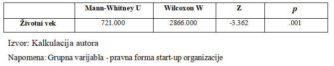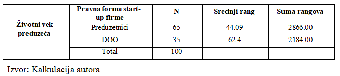 Uzimajući u obzir da je nivo statističke značajnosti p = 0.001, što je manje od 0.05, pri nivou greške od α = 0.05., moguće je prihvatiti treću hipotezu. Preciznije, u uzorku istraživanih preduzeća postoji statistički značajna povezanost između životnog ciklusa start-up firmi i pravne forme, Mann- Whitney U = 721.000, Z = -3.362, i p = 0.001. Na osnovu srednjeg ranga, moguće je tvrditi kako je životni vek start-up organizacija osnovanih u formi DOO (62.4) duži od preduzetničkih sa rangom od 44.09 (Tabela 5).
