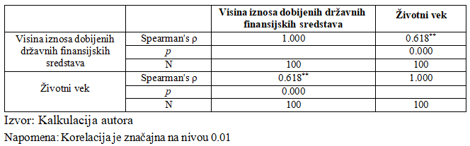 Konačno, istražena je peta hipoteza koja glasi da visina iznosa dobijenih državnih finansijskih sredstava, utiče na trajanje životnog veka start-up firmi u Srbiji. Proverom uzoračkih podataka utvrđeno da je životni vek redosledna veličina, tako da je korišćen je Spirmanov koeficijent korelacije ranga.