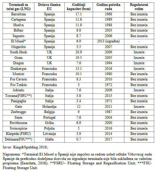 U Evropskoj uniji, gotovo polovina članica poseduje ili velike terminale ili manje kapacitete za tečni prirodni gas. Te članice poseduju terminale za uvoz tečnog prirodnog gasa, odnosno terminale u kojima se vrši proces regasifikacije –prevođenje tečnog gasa u gasovito stanje, kako bi se dalje transportovao kroz sistem cevovoda. Treba napomenuti da i Turska, koja nije članica Unije, ali ima status kandidata za članstvo, takođe poseduje terminale za tečni prirodni gas. Prema podacima koji se odnose na period do kraja 2017. godine, u Evropi (uključujući i Tursku) bilo je 28 velikih terminala za uvoz tečnog gasa sa kapacitetom od 227 milijardi kubnih metara, koji mogu da zadovolje oko 40% evropskih potreba za gasom (King&Spalding, 2018). U tabeli ispod (Tabela 1) su obuhvaćeni samo terminali za prijem tečnog gasa velikog kapaciteta, dok su izostavljena manja postrojenja, poput onih u Danskoj, Švedskoj i Finskoj.