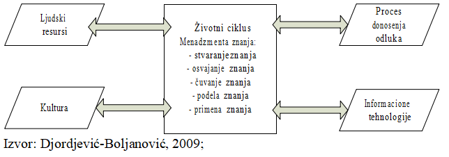 Koncept menadžmenta znanja ima zadatak da obezbedi kolektivno znanje zaposlenih kako bi oni mogli ostvariti poslovne ciljeve organizacije. On mora da pored postojećeg znanja u organizaciji obezbedi i neophodno i dostupno znanje iz spoljašnjih izvora, koje bi se ugradilo u poslovne procese organizacije. To znanje mora biti dostupno svim zaposlenima u organizaciji, u dokumentima i bazama podataka, i promovisano kroz afirmativnu organizacionu kulturu kako bi se prenosilo i koristilo kroz čitavu organizaciju(Mihajlović i dr., 2020; Vukša i dr., 2020). Koncept menadzmenta znanja mora da obezbedi i analitičku dimenziju primene znanja u organizaciji i njegove pozitivne i negativne aspekte primene kako bi se nastavio proces stvaranja i primene novih, neophodnih znanja. U literaturi postoji veliki broj definicija menadzmenta znanja i u najširem pristupu tom konceptu većina autora ističe jedinstvo tri komponente: ljudi, procesa i tehnologije(Anđelić i Majstorović, 2016; Majstorović i dr, 2020). Ljudi predstavljaju najbitniju komponentu u konceptu menazmenta znanja ali moraju biti podržani savremenim tehnologijama u jednom dinamičnom procesu koji iziskuje savremeno poslovanje. Taj dinamičan proces kroz koji organizacija upravlja znanjem, i prolazi kroz niz faza, formirajući pri tom životni ciklus menadzmenta znanja. Proces menadzmenta znanja obuhvata pet faza (Sydanmaanlakku, 2002):