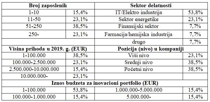 Na osnovu referentnog istraživanja u prvoj polovini 2020. godine izvršeno je istraživanje u Srbiji koje je imalo za cilj da utvrdi kako strateška orijentacija kompanija utiče na performanse procesa IPPM i poslovni uspeh. U rezultate istraživanja su ušli odgovori 130 kompanija koje su popunile upitnik koji je imao 14 pitanja, grupisanih u četiri oblasti: implementacija strategije (4 pitanja), balans portfolija (3 pitanja), prosečan uspeh završenih inovacionih projekata (4 pitanja) i sinergetska eksploatacija (3 pitanja). Pored 14 pitanja koja su korišćena za analizu uspeha inovacionog portfolija u upitniku je bilo i 5 pitanja koja treba da daju karakteristike uzorka kao što su: broj zaposlenih, visina prihoda u 2019. godini, iznos budzeta za inovacioni portfolio (u evrima), sektor delatnosti i pozicija (nivo) u kompaniji. Anketirani su svoje odgovore iskazivali u upitniku putem 7-stepene Likertove skale, koja se kretala u rasponu od 1-apsolutno se slažem do 7-apsolutno se ne slažem, kakva je korišćena i u referentnom istraživanju. Istraživanje je sprovedeno u malim i srednjim preduzećima za razliku od referentnog istraživanje u Nemačkoj koje je sprovedeno na srednjim i velikim kompanijama, što se vidi i iz same strukture uzorka kada se uporede broj zaposlenih, visina prihoda i iznos budzeta za inovacioni portfolio.