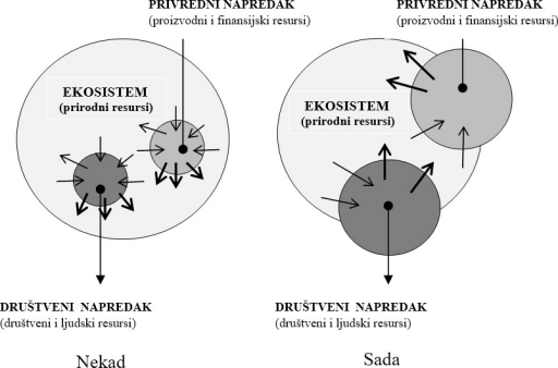 Slika 1. Odnos društvenog napretka i ekonomije prema ekosistemu (nekad i sada)