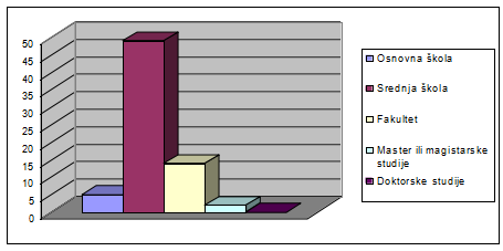 Kada je reč o stepenu stručne spreme, 70% ispitanika ima srednju stručnu spremu, dok 20% njih ima završen fakultet (grafikon 2).