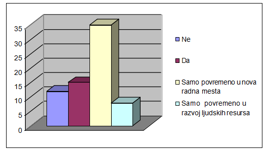 U ekonomiji zasnovanoj na znanju, razvoj svake države zavisi od kvaliteta njenih ljudskih resursa (Bojicic i Dajić, 2017.). Tokom proteklih nekoliko godina, Srbija je zauzimala 66. mesto u svetu u pogledu ljudskog razvoja, što je niže nego bilo koja zemlja članica Evropske unije, i što predstavlja znatno slabiju performansu u odnosu na period od pre trideset godina (CEVES, 2018.). Istraživanje pokazuje da i trgovinska preduzeća na teritoriji grada Kruševca ne ulažu dovoljno u razvoj ljudskih resursa. Najviše se, prema mišljenjima 51% ispitanika, investira u nova radna mesta (Grafikon 8).