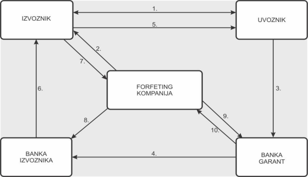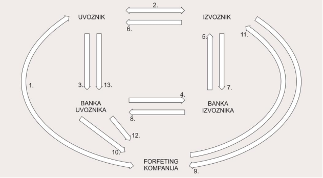 Na grafičkom prikazu forfeting transakcije (Slika 1) možemo identifikovati korake koje prate mehanizam zaključenja forfeting transakcije: