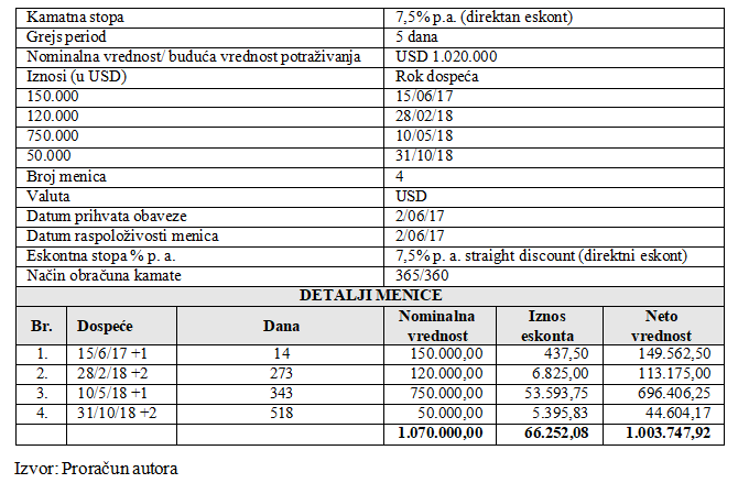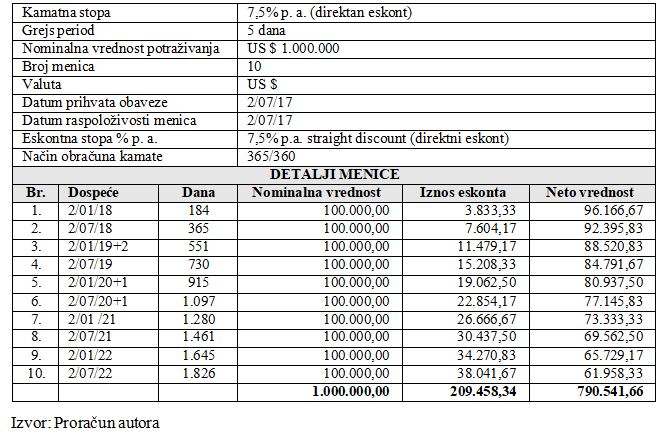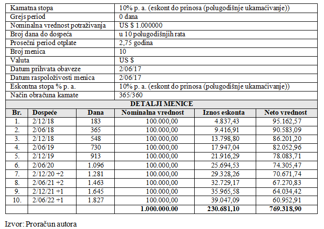 Ilustracije radi daje se primer seta menica uz primenu metode eskonta do prinosa sa polugodišnjem ukamaćivanjem u Tabeli 3.