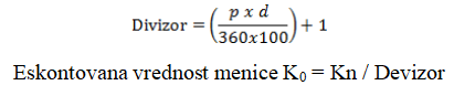 gde je: E – eskont (kamata), K0 – sadašnja vrednost (neto vrednost tj. isplaćen iznos nakon odbitka kamate ili eskonta), Kn – buduća vrednost potraživanja (ili nominalna vrednost potraživanja), d – broj dana do dospeća potraživanja, p – eskontna stopa (%), a eskontovana vrednost potraživanja (eskontovan iznos) je K0 = Kn – E.