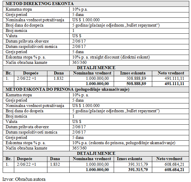 Uporedni prikaz direktnog eskonta i eskonta do prinosa (obračunatog polugodišnje), prilagođeno prema Lütschg-Emmenegger (1998), prikazan je u Tabeli 4. Možemo primetiti da se neto vrednost menice razlikuje, tj. da je njena vrednost veća, ukoliko primenimo metod ekonta do prinosa.
