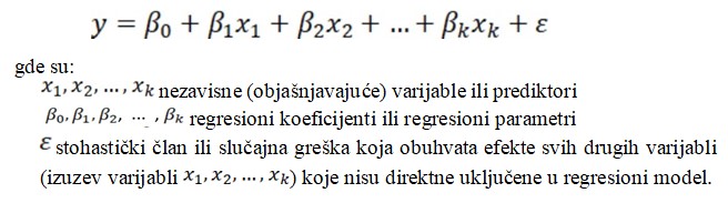 U ovom istraživanju biće upotrebljena regresiona analiza uticaja dve ili više objašnjavajućih varijabli na zavisnu varijablu, tj. višestruka ili multiple regresija. Ovom regresijom smo utvrdili koliko procenata varijabiliteta zavisne varijable je objašnjeno određenim skupom nezavisnih varijabli i koliki je relativni doprinos svake nezavisne varijable uključene u regresionu analizu. Višestruka logistička regresija je statistički metod na osnovu kojeg se ispituje uticaj više nezavisnih faktora na jedan zavisni faktor (Rosner, 2011; Radović-Marković i Hanić, 2018):