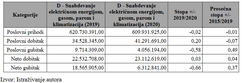 Tabela 1. Dinamika poslovnog prihoda, poslovnog i neto dobiti/gubitka u okviru sektora D – Proizvodnju i snabdevanje električnom energijom, gasom i vodom u Republici Srbiji za 2019–2020. i 2015–2019. godinu