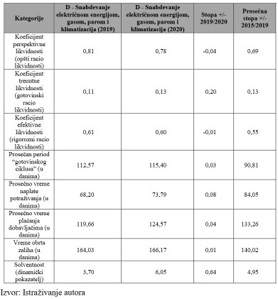 U okviru sektora D – Proizvodnju i snabdevanje električnom energijom, gasom i vodom i njegovih podsektora, u cilju ispitivanja uticaja nezavisnih varijabli (parametara likvidnosti i solventnosti) u periodu pre Covid-19 (2015–2019. godina) i u toku Covid-19 pandemije (2020. godina) na stopu povrata aktive regresionom analizom. Autori su uzeli za nezavisne varijable: Koeficijent tekuće likvidnosti (opšti racio likvidnosti), Koeficijent trenutne likvidnosti (novčani racio likvidnosti), Koeficijent ubrzane likvidnosti (rigorozni racio likvidnosti), Solventnost (dinamički pokazatelj) i Zaduženost. Zavisna varijabla je Stopa povrata aktive. Za analizu podataka ovog rada upotrebljen je statistički programski paket SPSS.