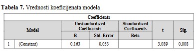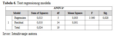 F-vrednost u Tabeli 6, testira da li je regresioni model dobar. Iz prikazane tabele uočava se da nezavisne varijable statistički dobro predviđaju zavisnu varijablu (Sig. = 0,028) i to zapravo znači da je naš regresioni model dobar F =3.560, p<0,05.
