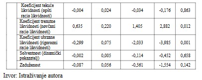 Koeficijent tekuće likvidnosti (opšti racio likvidnosti), Koeficijent trenutne likvidnosti (novčani racio likvidnosti), Koeficijent ubrzane likvidnosti (rigorozni racio likvidnosti), Solventnost (dinamički pokazatelj) i Zaduženost. Zavisna varijabla je Stopa povrata aktive (eng. ROA). U Tabeli 5, „R” predstavlja vrednost koeficijenta višestruke korelacije koji se koristi za određivanje kvaliteta predviđanja zavisne varijable, u ovom slučaju ROA. Vrednost od 0,748 predstavlja dobar nivo predviđanja. Kolona „R kvadrat“ predstavlja koeficijent odlučivanja, odnosno odnos disperzije zavisne varijable koji se može objasniti nezavisnim varijablama, odnosno 56% varijabilnosti zavisne varijable koja se može objasniti nezavisnim varijablama.