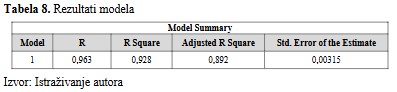 U Tabeli 8, „R” predstavlja vrednost koeficijenta višestruke korelacije koji se koristi za određivanje kvaliteta predviđanja zavisne varijable, u ovom slučaju ROA. Vrednost od 0,963 predstavlja dobar nivo predviđanja. Kolona „R kvadrat“ predstavlja koeficijent odlučivanja, odnosno odnos disperzije zavisne varijable koji se može objasniti nezavisnim varijablama, odnosno 92,8% varijabilnosti zavisne varijable koja se može objasniti nezavisnim varijablama.