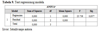 F-vrednost u Tabeli 9, testira da li je regresioni model dobar. Ova tabela pokazuje da nezavisne varijable statistički dobro predviđaju zavisnu varijablu (Sig. = 0,037) i to zapravo znači da je naš regresioni model dobar F = 25.756, p <0,05.