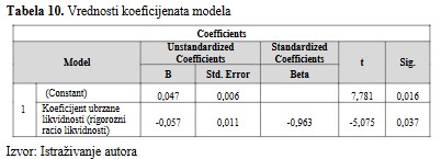 Na osnovu rezultata prikazanih u Tabeli 10 primećuje se da u toku Covid-19 pandemije koeficijent ubrzane likvidnosti (β = -0,057, Sig.= 0,037) daje statistički značajnu predikciju Stope povrata aktive (ROA).