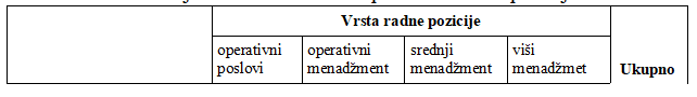 Ukoliko posmatramo vrstu radne pozicije (Tabela 4) najveći broj ispitanika zaposlen je na pozicijama u kategoriji operativnih poslova, zatim slede više menadžerske pozicije, srednji menadžment, te operativni menadžment.