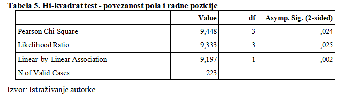 Hi-kvadrat analizom (Tabela 5) ustanovljeno je postojanje asocijacije između varijabla pol i radna pozicija (χ2 (3, N = 223) = 9,45, p =,02), odnosno pokazano je da na datom uzorku zaposlenih, pol nije nezavisan od kategorije radne pozicije. Detaljnijom analizom odnosa relativnih frekvenci može se uočiti da je preko polovine (54,8%) pripadnica ženskog pola zaposleno na poslovima operativnog tipa (dakle, najniže rangiranih radnih mesta), dok je u okviru pripadnika muškog pola, njih nešto preko trećine (36,4%). Na pozicijama u okviru operativnog i srednjeg menadžmenta podjednako su zastupljeni ženski i muški ispitanici (11% žena i 10,4% muškaraca, koji rade na pozicijama operativnog menadžmenta; 15,8% žena i 18,2% muškaraca na pozicijama srednjeg menadžmenta). Konačno, više od trećine (35,1%) muških ispitanika radi na višim menadžerskim pozicijama, dok je to slučaj kod svega 18,5% ispitanica. Ovim je potvrđena hipoteza H2, prema kojoj su žene u sektoru turizma zaposlene na nižim radnim pozicijama u odnosu na svoje muške kolege. Prikazani rezultati ukazuju i da žene daleko manje od muškaraca dospevaju na najviše menadžerske pozicije, što implicira postojanje barijera prilikom napredovanja u karijeri, a što bi moglo biti predmet nekog budućeg istraživanja, naročito ako imamo u vidu da brojnost žena u sektoru turizma i stepen njihovog obrazovanja nisu faktori prepreka.