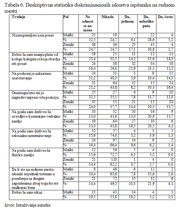 Iskustva o rodnoj neravnopravnosti na radu ispitivana kroz osam tvrdnji, postavljenih na osnovu literature i prakse, a po uzoru na istraživanje sprovedeno u susednoj Hrvatskoj (Kamenov, Galić, 2011) prikazana su u tabeli 6. Tvrdnje označavaju diskriminaciona iskustva koja se najčešće sreću na tržištu rada. Ispitanici su odgovarali da li se i koliko često određena tvrnja odnosi na njih.