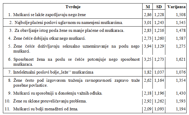 Viši skor ukazuje na veći stepen rodno neravnopravnih ili stavova koji ukazuju na veći doživljaj postojanja rodne neravnopravnosti na radnom mestu. Tako ispitanici najviši stepen neravnopravnosti na radu nalaze u tvrdnjama da žene češće doživljavaju seksualno uznemiravanje na poslu nego muškarci, da se sposobnost žena na poslu češće potcenjuje, nego sposobnost muškaraca, da žene uglavnom dobijaju manje priznanja za svoj rad od muškaraca, te da su najbolje plaćeni poslovi uglavnom namenjeni muškarcima. Najmanji stepen slaganja ispitanici imaju sa tvrdnjama da su žene jednako posvećene svom poslu kao i muškarci, da intelektualni poslovi bolje „ležeˮ muškarcima, te da su muškarci bolji menadžeri od žena.