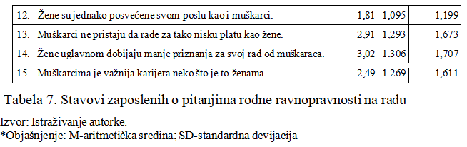 U okviru istraživanja stavova u vezi rodne ravnopravnosti na radu analizirano je 15 zadatih tvrdnji (Tabela 7), koje su sačinjavale skalu rodne ravnopravnosti u vezi sa radom. Odgovori su takođe davani na istovetnoj petostepenoj Likertovoj skali. Dvanaesta po redu tvrdnja, čiji je iskaz u suprotnom smeru od ostalih, je najpre redukovana (dakle odgovori 1 i 2 se tretiraju kao 4 i 5 i obrnuto). Izračunat je prosečni skor za svakog ispitanika na ovoj skali.