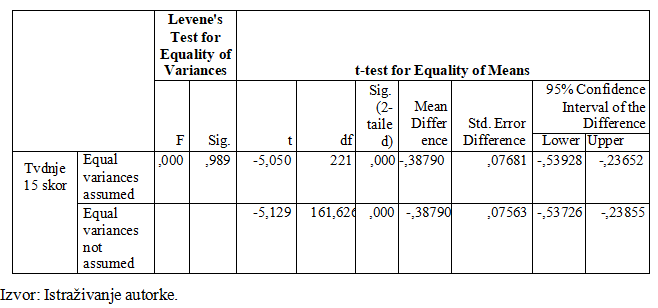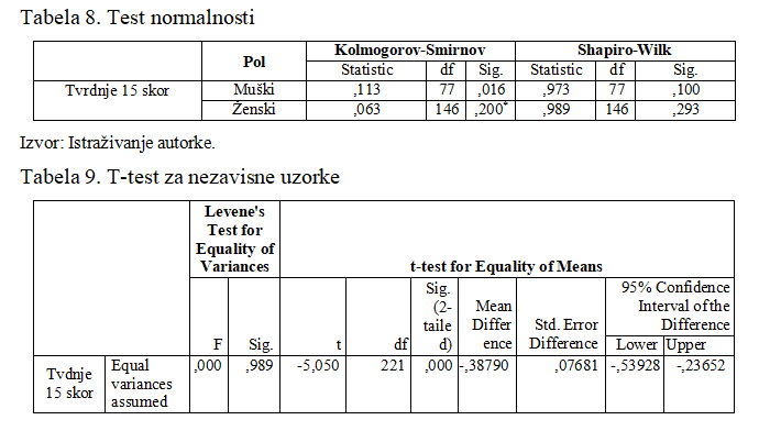 S obzirom na to da se odgovori normalno raspodeljuju i kod muških i kod ženskih ispitanika, na šta nam ukazuje Kolmogorov-Smirnov test (Tabela 8), kao i da je ispunjen preduslov homogenosti varijansi (F=,00, p=,99) sproveden je parametrijski test razlika između odgovora muških i ženskih ispitanika, odnosno t- test za nezavisne uzorke (Tabela 9).