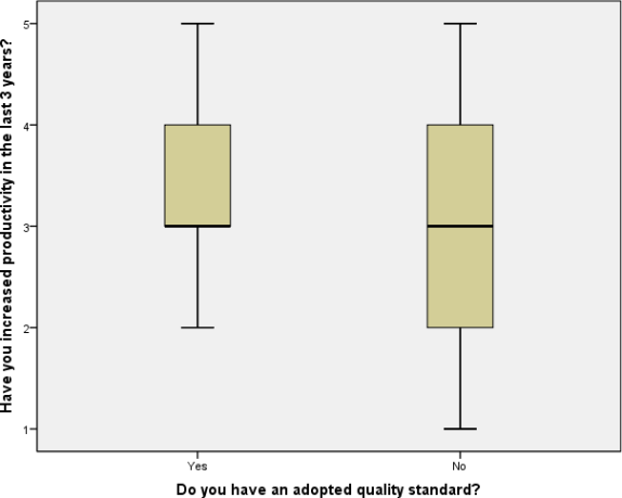 Independent samples T Test compared the results of the assessment of productivity increase for companies that have an adopted quality standard (Yes) and those that do not (No). It was determined that there was a significant difference between Yes (Mean=3.24, SD=0.875) and No (Mean=2.86, SD=0.899); t(110)=2.235, p=0.027. The difference between the mean values of the characteristics by groups (Mean Difference=0.386, 95% CI: 0.044 to 0.728) was medium,