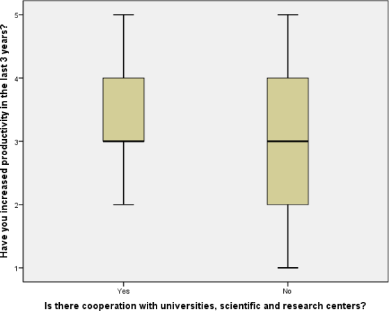 Independent samples T Test compared the results of the assessment of productivity increase for companies that have cooperation with universities or scientific research centers (Yes) and those that do not (No). It was determined that there was no significant difference between Yes (Mean=3.21, SD=0.890) and No (Mean=2.93, SD=0.900); t(110)=1.585, p=0.116. The IQR for the Yes option is (Q3-Q1=4-3) 1, while for the No option it is (Q3-Q1=4-2) 2.