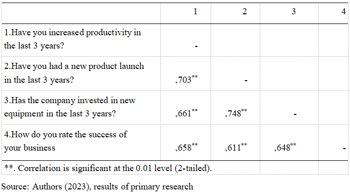 In Table 1, it can be seen that among the variables: Have you increased productivity in the last 3 years and has the company invested in new equipment in the last 3 years; Have you increased productivity in the last 3 years and how do you evaluate the success of your business; have you launched a new product in the last 3 years and how do you rate the success of your business; Whether the company has invested in new equipment in the last 3 years and how you rate the success of your business, there are significant linear relationships. While among the variables: Have you increased productivity in the last 3 years and have you had a new product launch in the last 3 years; whether you had a new product launch in the last 3 years and whether the company invested in new equipment in the last 3 years there are strong linear associations. This practically means that companies that invested in new equipment and introduced new products achieved improvements in business.