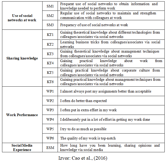 The sample was stratified so that it consisted of millennials, people born between 1981 and 1996 (Pew Research Centre, 2019). The sample consisted of 183 respondents. A structured electronic survey questionnaire was used as the instrument for data collection. Respondents were collected through various communication channels and social networks. The structure of the questionnaire is shown in Tables 1 and 2. The Google Forms tool was used to easily fill out the questionnaire. When measuring the components of social media use, knowledge sharing, work performance and the control variable experience on social networks, the items shown in Table 2 were used.