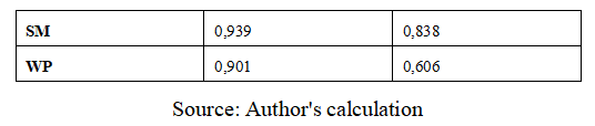Table 4 presents the values (Outer Loadings) of the loading indicators for the component uses of social networks, knowledge sharing, work performance and the control variable experience on social networks. Some authors (Hair et al., 2011; Grubor and Milićević, 2019) state that the aforementioned criterion should be equal to or greater than 0.7. However, for the WP1 indicator, its value is 0.610. The reliability criterion was lowered to 0.6, this was done in accordance with the research of the authors Bagozzi and Yi (1988). Due to the lowering of the loading indicator criteria, the aforementioned indicator was retained since the value 0.6 can be used for the minimum criterion level. After testing the reliability of the latent construct indicators, the internal consistency of the constructs is tested using the composite reliability indicator (Compostite Reliability), and the convergent validity of the constructs is tested using the Average Variance Extracted (AVE) indicator.