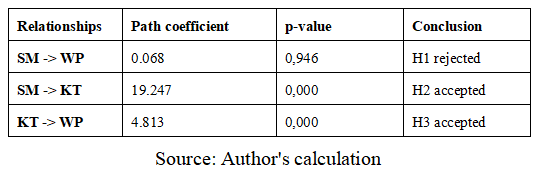 For this purpose, the “HTMT” criterion was applied. As shown in Table 6, all HTMT values are lower than 0.85, indicating that there is no problem with discriminant validity. Table 7 shows the VIF values. Since it is less than 5 for all three constructs, it can be concluded that there is no problem with multicollinearity. In order to test the hypotheses, the statistical significance of the path coefficients (“Path Coefficients”) was analyzed using the “Bootstrapping” procedure. The path coefficients and the accompanying p-values are shown in the following table. Table 8 shows that the influence of social networks on work performance has a path coefficient of 0.068, indicating a positive relationship, however, the calculated p-value does not satisfy the reference frame (0.946), and for this reason, hypothesis H1 must be rejected. The influence of social networks in the workplace has a positive relationship with knowledge sharing, the path coefficient is 19.247. In this regard, the p-value satisfies the reference frame, so hypothesis H2 is accepted. The influence of knowledge sharing on work performance records a coefficient of 4.813, which indicates a positive relationship, also the p-value moves within the reference frame, so hypothesis H3 is accepted.