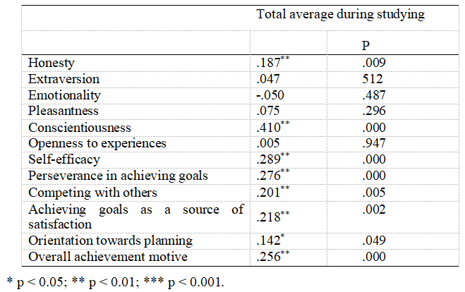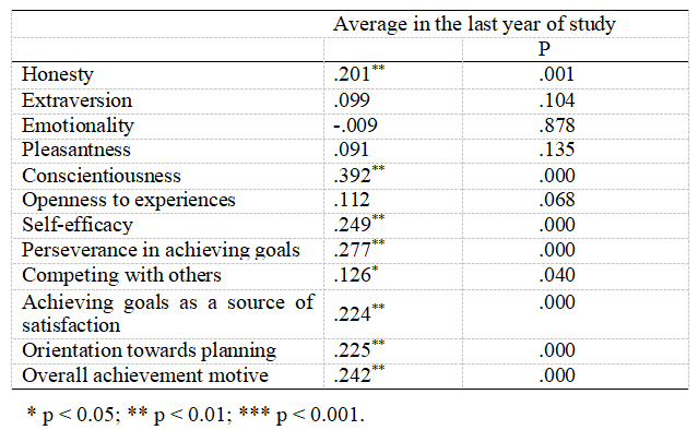 The results showed statistically significant positive correlations of the traits of honesty, extraversion and conscientiousness on the one hand and satisfaction with academic achievement on the other. The traits of emotionality, agreeableness, and openness to new experiences are not related to satisfaction with academic achievement. Furthermore, there is a statistically significant positive correlation of self-efficacy and satisfaction with academic achievement. Statistically significant positive correlations of all dimensions as well as the overall motive of achievement on the one hand and satisfaction with academic achievement on the other hand were established.