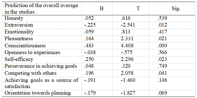 The data in Table 3 indicate that statistically significant positive correlations were found between the traits of honesty and conscientiousness on the one hand and the overall average across the studies on the other hand. Furthermore, the traits of extraversion, emotionality, agreeableness and openness to new experiences are not related to the overall average in the studies. The results showed a statistically significant positive correlation of self-efficacy and the overall average in studies.