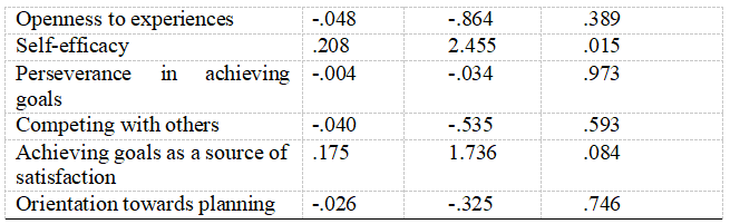 The multiple correlation coefficient (R= 0.541) is statistically significant (F (11) =9.617; Sig = .000). It was found that 26% of the variability (R Square = 0.263) of satisfaction with academic success can be explained based on a set of predictors of personality traits, self-efficacy and achievement motive dimensions. The results showed that honesty and self-efficacy are statistically significant predictors of satisfaction with academic success. Other predictors are not statistically significant.