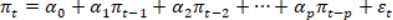 Nakon toga, kreiran je autoregresioni model AR(p) reda. U modelu su uzete vrednosti reda od 1 do 12, s obzirom na mesečnu frekvenciju dostupnih podataka. AR(p) model za inflaciju dat je u sledećoj formi: