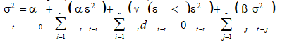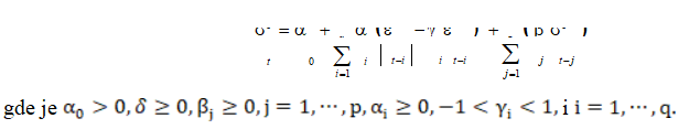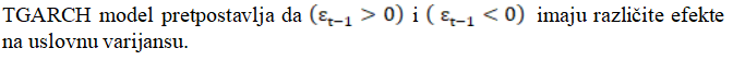 Zakoian je predstavio TGARCH (p,q) model kao alternativu EGARCH procesu, gde je asimetrija pozitivnih i negativnih inovacija inkorporirana u model korišćenjem indikatora funkcije (Zakoian, 1994):