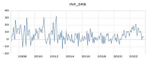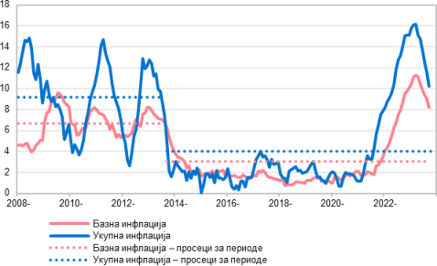 Inflacija u Srbiji je bila volatilna u periodu 2008-2013. godine, na šta su uticali šokovi iz međunarodnog okruženja (rast svetskih cena nafte i primarnih poljoprivrednih proizvoda) tokom 2010. i 2012. godine, kao i efekti deprecijacije dinara u uslovima ekspanzivne fiskalne politike naročito tokom 2012. godine. Od kraja 2013. sve do sredine 2021. godine inflacija u Srbiji je bila niska i stabilna i u proseku je iznosila oko 2%. Na to su uticali i niski inflatorni pritisci iz međunarodnog okruženja, ali i obezbeđena relativna stabilnost deviznog kursa, koordinacija monetarne i fiskalne politike i efekti fiskalne konsolidacije koji su uticali na nižu domaću tražnju. Od septembra 2021. inflacija ubrzava kao posledica brojnih šokova iz međunarodnog okruženja – naglog rasta tražnje u uslovima ograničene ponude nakon otvaranja brojnih ekonomija nakon prve faze pandemije, što je za posledicu imalo zastoje u globalnim lancima snabdevanja i poskupljenje transporta, zatim znatan rast svetskih cena primarnih proizvoda i industrijskih sirovina, naročito nakon izbijanja rata u Ukrajini, pojava energetske krize i dr. To je dovelo do znatnog rasta cena hrane i energenata i na domaćem tržištu, a rast uvozne inflacije se odrazio i na rast bazne inflacije, koja se ipak sve vreme kretala ispod ukupne inflacije. Od aprila 2023, zahvaljući restriktivnim merama monetarne politike i popuštanju globalnih troškovinih pritisaka inflacija u Srbiji se nalazi u padu i krajem 2023. bila je dvostruko niža (7,6% međugodišnje) nego krajem 2022.