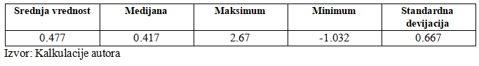 Rezultati deskriptivne statiske prikazani u tabeli (1.) pokazuju da stopa mesečne inflacije raste 0.5 procenata mesečno. Raspon između maksimalne i minimalne prosečne stope inflacije iznosi oko 4 procenata što uz standardnu devijaciju od 0.6 procenata ukazuje na visoku volatilnost zabeleženu u posmatranom periodu.