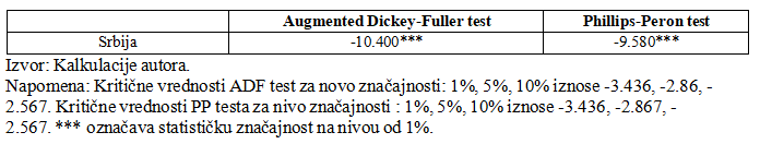 U radu smo primenili nekoliko testova jediničnog korena: ADF (Augmented Dickey –Fuller) i PP (Phillips and Perron), kojima se nultom hipotezom pretpostavlja postojanje jediničnog korena, a alternativnom stacionarnost serija.
