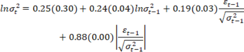 U sledećem koraku primenom GARCH modela ocenjena je inflaciona neizvesnost pri čemu su kao kriterijum izbora odgovarajućeg modela korišćeni Akaike i Schwarz informacioni kriterijumi, a vodilo se računa i da ocenjeni koeficijenti odgovarajuće specifikacije budu statistički značajni i ispravnog znaka. Tabela sa specifikacijama modela prikazana je u sledećoj tabeli, a u nastavku su prikazani detaljniji rezultati ocenjivanja. Kao najbolji model se pokazao EGARH model, dok ostali modeli (GARCH, TGARCH i APARCH) koji su takođe testirani ili nisu imali statistički značajne koeficijente ili su imali veće vrednosti Akaike i Schwarz informacionog kriterijuma od EGARCH modela.